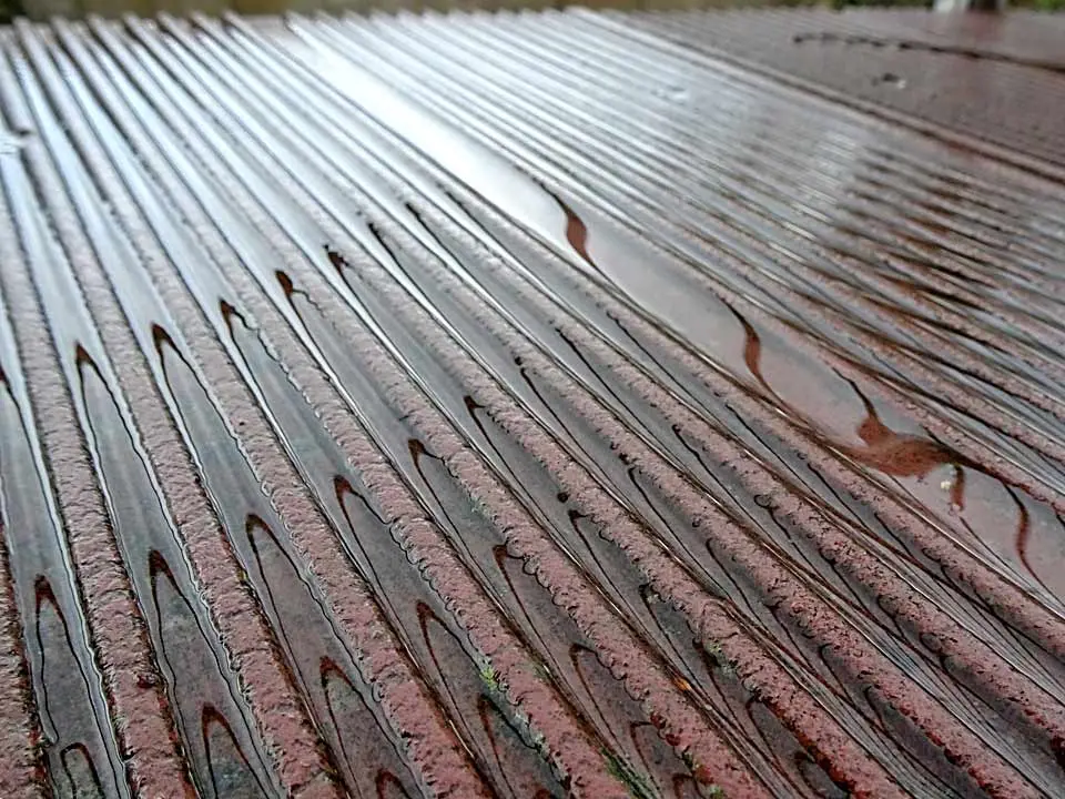 Das Regenwasser steht in den Vertiefungen, die Schuhsohle bleibt trocken auf den Rippen.