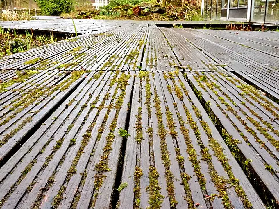Wenn man die Pflege vernachlässigt, trocknen die Bretter aus Holz nicht richtig ab. Früher oder später wächst Moos.