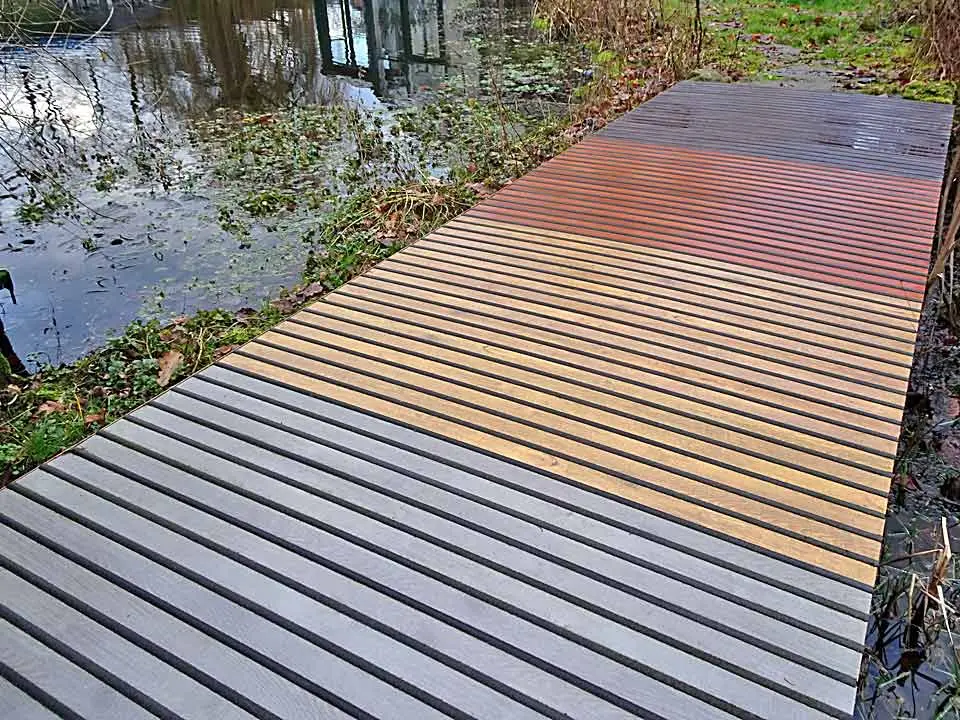 Im Unterschied zu Holz quillt und schrumpft Aluminium kaum, verrottet nicht und ist unempfindlich gegen dauerhafte Feuchtigkeit. Im Vergleich zu WPC oder anderen Mischstoffen gibt es keine Holzanteile, die Wasser aufnehmen und später verrotten könnten. Die Kombination aus Alu-Schale und Silikon-Profilen hat sich auf langen Laufstrecken im NaturaGart-Park als sehr robust, rutschfest und pflegearm erwiesen.
