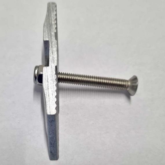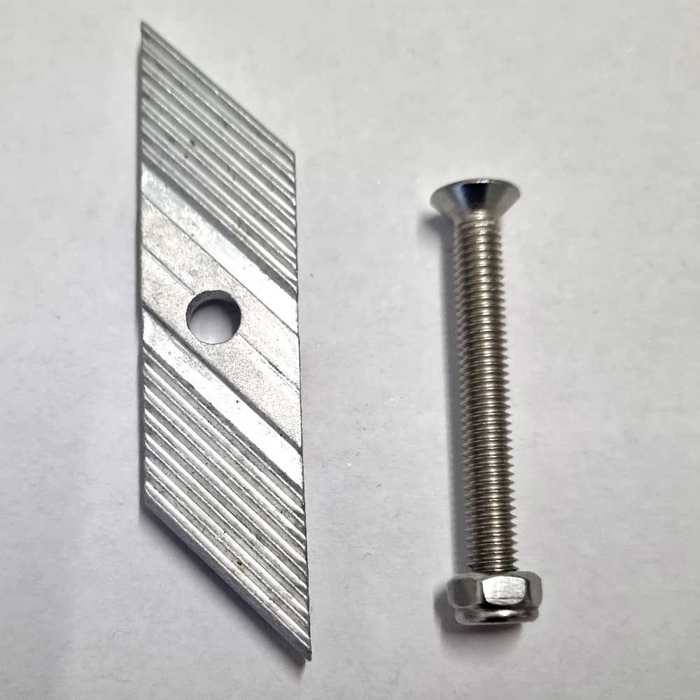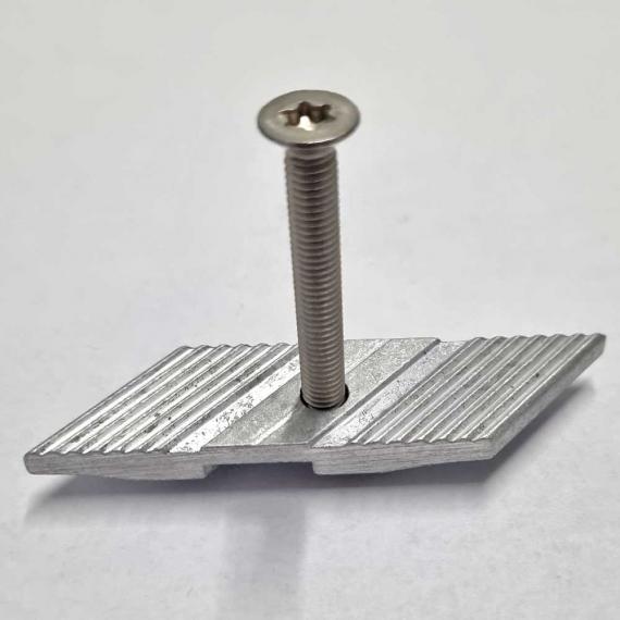Das Klemmstück krallt sich in das Riffelprofil des Trägers, die Schraube befestigt das Brett. Die Verschraubung des Brettes erfolgt auf allen Trägern.