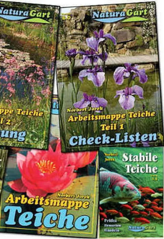 Die verschiedenen NaturaGart-Anleitungen zum Bauen von Teichen und zur Gestaltung des Ufers haben unterschiedliche thematische Schwerpunkte. Die vierbändige Arbeitsmappe Teiche erläutert ausführlich die Arbeitsschritte und Problemstellungen bei der Planung und beim Bau wie auch bei der Pflege der Gewässer. Der erste Band der Arbeitsmappe enthält Checklisten, deren umfassender, alle Bereiche abdeckender Fragenkatalog eine wichtige Hilfe für die Erarbeitung des Entwurfs und für die Planung des Teichprojekts ist. In den Bau- und Planungsanleitungen für Schwimmteiche nach dem NaturaGart-System und in der Anleitung für die Anlage von Bächen, Quellen und Wassergräben sind alle Aspekte, die beim Bau dieser Wasserläufe zu beachten sind, aufgeführt. Das Handbuch "Stabile Teiche" beschreibt verständlich die biologischen Grundlagen von Teichen und bietet Handlungsanleitungen zur Aufrechterhaltung eines stabilen Gleichgewichts im Wasser.