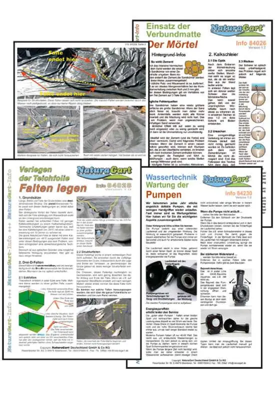 Die gedruckten Anleitungen werden gegen eine Schutzgebühr abgegeben, damit du sie frühzeitig nutzen kannst. Wenn du später die passenden NaturaGart-Produkte kaufst (z. B. Teichfolie, Pumpentechnik, Baumaterial für Filtergräben oder Teichpflanzen), wird diese Schutzgebühr vollständig verrechnet. Für NaturaGart-Kunden sind die Anleitungen damit letztlich kostenlos.