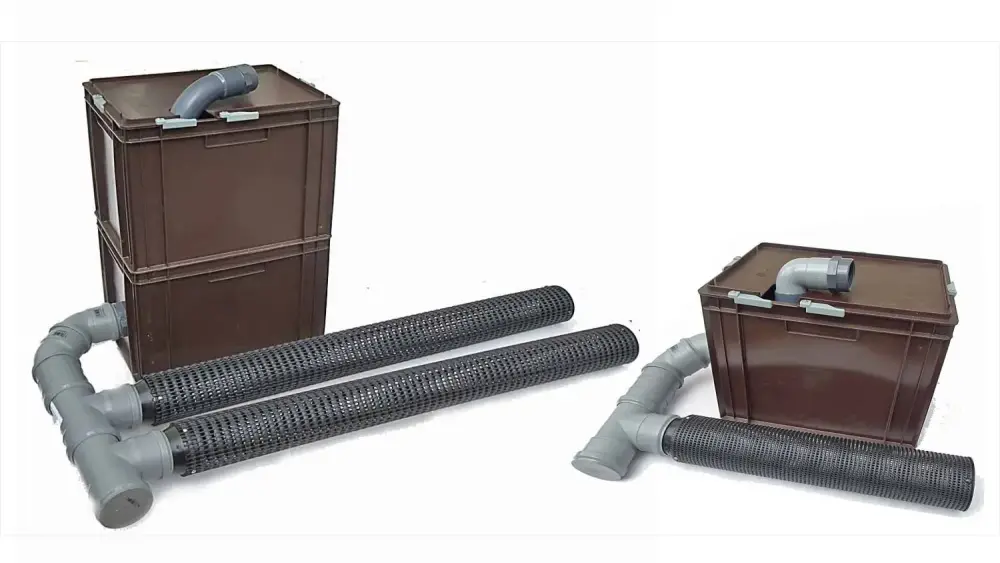 Mit modularen Erweiterungsstücken: Vorfilter können über T-Stücke beliebig erweitert werden, sowohl für Kiesansaugung (grob) als auch für Freiwasseransaugung (fein). Dies erhöht die Ansaugoberfläche und verlängert die Wartungsintervalle.