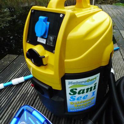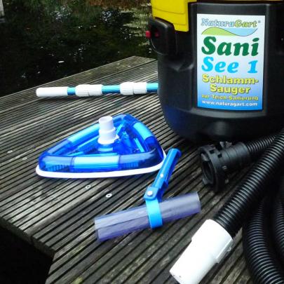 Hinweis: Der SaniSee 1 lässt sich mit nützlichem Zubehör erweitern. Für größere Teichanlagen gibt es die Verlängerungen für den Saug- und Ablaufschlauch. Um den Sauger und das Filternetz zu schonen ist der Vorabscheider eine ideale Ergänzung. Grobes, schweres Sauggut, z.b. Tannenzapfen, aber auch Molche, Frösche und Kröten werden im Vorabscheider separiert und können wieder in die Freiheit entlassen werden. Der Feinfiltersack ist eine ideale Ergänzung um Wasser zu sparen.